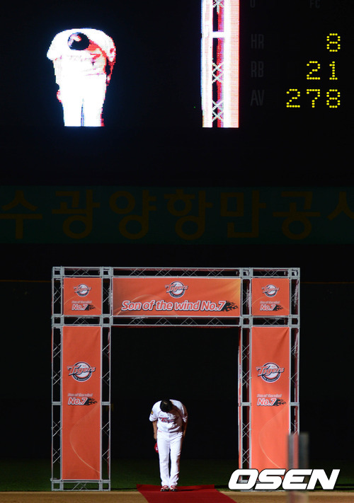 26일 오후 광주 무등야구장에서 열린 이종범 선수의 은퇴식에서 KIA 관중석을 향해 인사를 하고 있다.