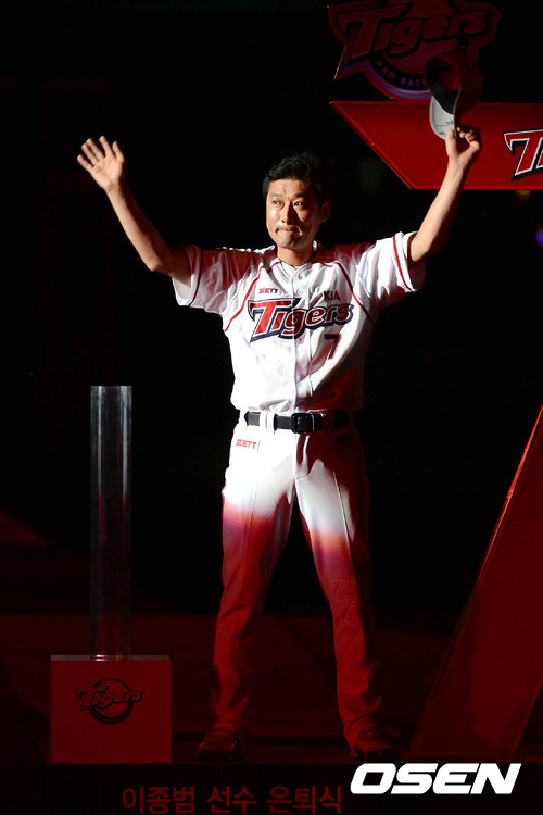 26일 오후 광주 무등야구장에서 열린 이종범 선수의 은퇴식에서 이종범이 관중석을 향해 인사를 하고 있다.