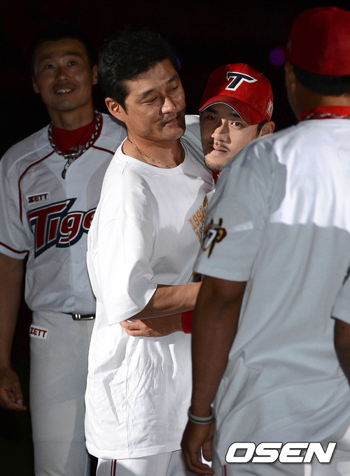 26일 오후 광주 무등야구장에서 열린 이종범 선수의 은퇴식에서 은퇴식을 마친 이종범이 KIA 이용규와 인사를 나누고 있다.
