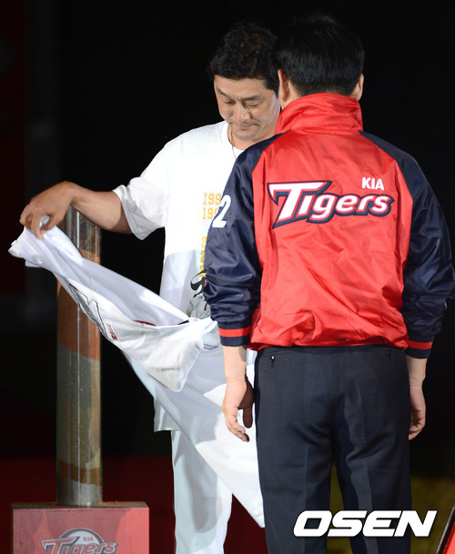 26일 오후 광주 무등야구장에서 열린 이종범 선수의 은퇴식에서 이종범이 김조호 KIA 단장에게 유니폼을 반납하고 있다.