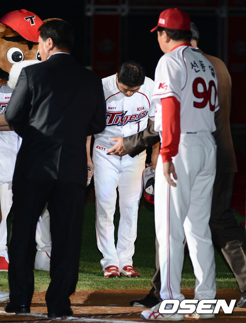 26일 오후 광주 무등야구장에서 열린 이종범 선수의 은퇴식에서 이종범이 KIA 선동렬 감독, 김응룡 전 해태 타이거즈 감독에게 인사를 하고 있다.