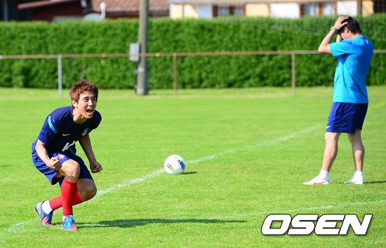 구자철이 훈련을 마친후 신홍기 코치와 골대 맞추기 내기에서 이긴후 환호하고 있다/ soul1014@osen.co.kr