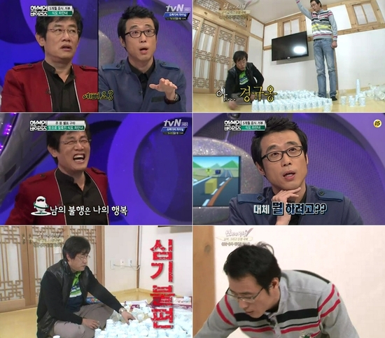 특히 지난 6일 방송된 '남자의 자격-남자, 그리고 단점을 극복하다'에서 이경규, 이윤석은 팀을 이뤄 인내심 기르기에 도전했다. 이날 이경규는 짜증이 가득한 표정으로 30층 종이컵 탑을 쌓기에 임했으나 이윤석은 그를 달래며 조심스럽게 프로젝트를 진행하는 대조적인 모습을 보여 웃음을 자아냈다.