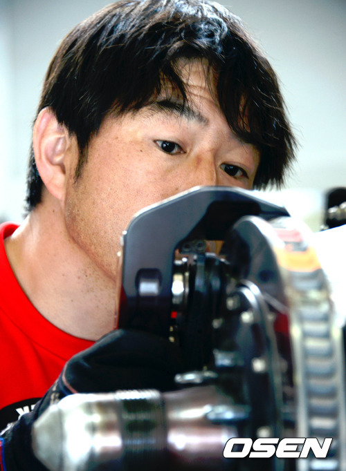27일 일본 오이타현 오토폴리스 인터내셔널 서킷에서 열린 'AUTOPOLIS SUPER 2&4 RACE 2012' 포뮬라 니폰 3라운드 결승 경기가 열렸다. 경기 전 4미닛의 정영훈 대표가 제네럴 매니저를 맡고 있는야마모토 나오키(무겐 팀)의 기술자가 구동 장치를 점검하고 있다.