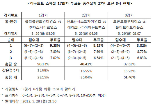 이번 야구토토 스페셜 17회차 게임은 28일(월) 오후 9시 50분에 발매가 마감된다. (끝)