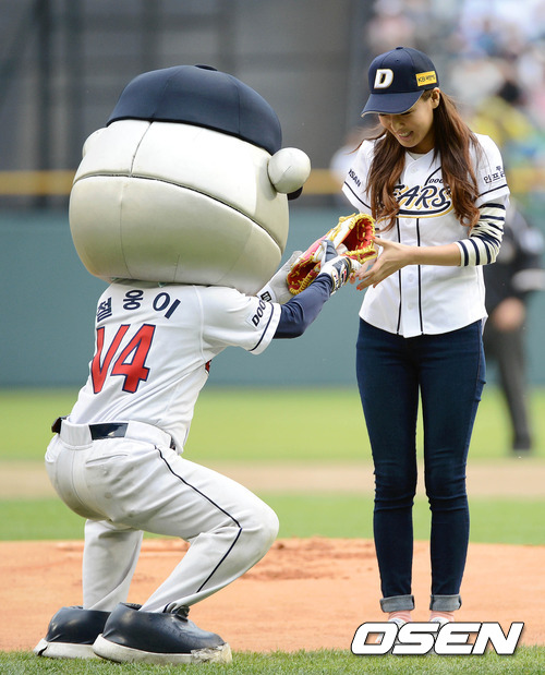 27일 오후 잠실야구장에서 열린 '2012 팔도 프로야구' 두산 베어스와 롯데 자이언츠의 경기에 앞서 원더걸스 유빈이 시구를 위해 두산 마스코트 철웅이에게 글러브를 받고 있다.