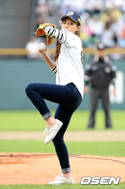 27일 오후 잠실야구장에서 열린 '2012 팔도 프로야구' 두산 베어스와 롯데 자이언츠의 경기에 앞서 원더걸스 유빈이 시구를 하고 있다.