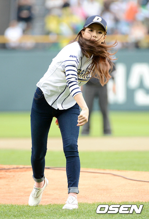 27일 오후 잠실야구장에서 열린 '2012 팔도 프로야구' 두산 베어스와 롯데 자이언츠의 경기에 앞서 원더걸스 유빈이 시구를 하고 있다.