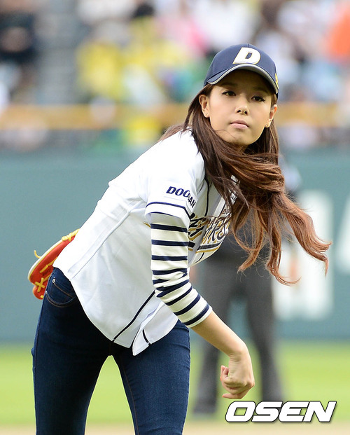 27일 오후 잠실야구장에서 열린 '2012 팔도 프로야구' 두산 베어스와 롯데 자이언츠의 경기에 앞서 원더걸스 유빈이 시구를 하고 있다.