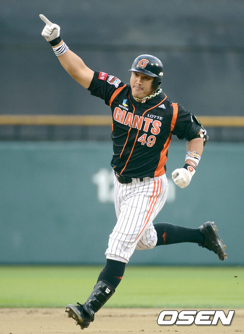 27일 오후 잠실야구장에서 열린 '2012 팔도 프로야구' 두산 베어스와 롯데 자이언츠의 경기, 1회초 1사 1,2루 롯데 홍성흔이 선제 우중월 스리런 홈런을 날리고 환호하고 있다.