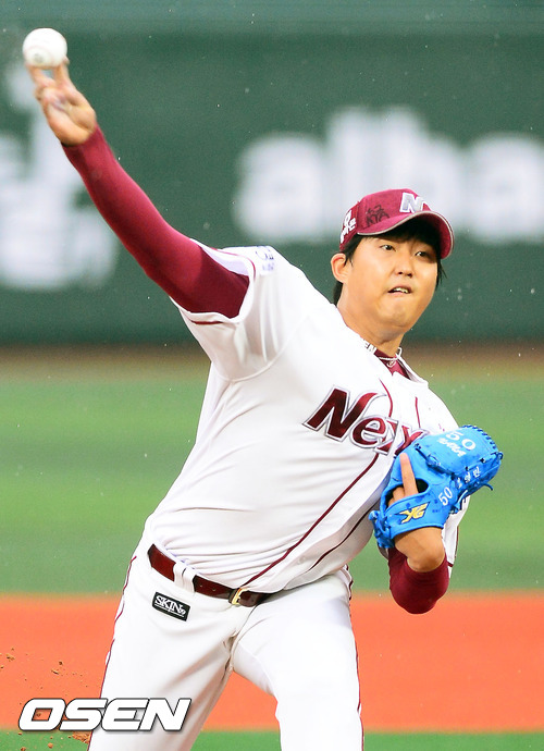 27일 오후 서울 목동구장에서 열린 넥센 히어로즈와 한화 이글스의 경기에서 넥센 선발 김영민이 힘차게 공을 뿌리고 있다.