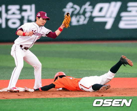 27일 오후 서울 목동구장에서 열린 넥센 히어로즈와 한화 이글스의 경기에서 3회초 무사 주자 1루 한화 장성훈 타석에서 1루 주자 한상훈이 2루 도루에 성공하고 있다.