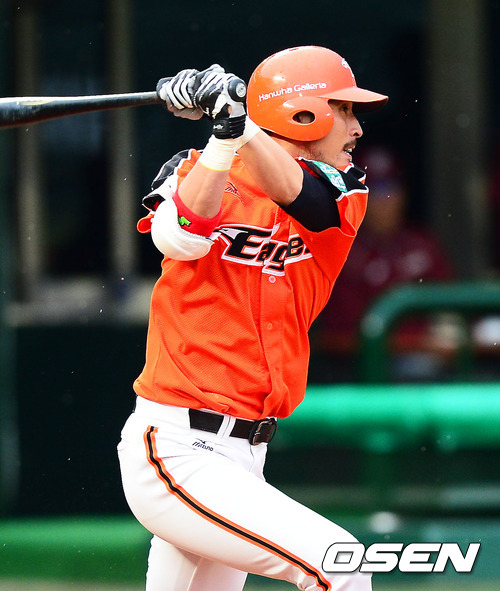 27일 오후 서울 목동구장에서 열린 넥센 히어로즈와 한화 이글스의 경기에서 5회초 1사 주자 3루 한화 김경언이 중견수 오른쪽 1타점 2루타를 날리고 있다.