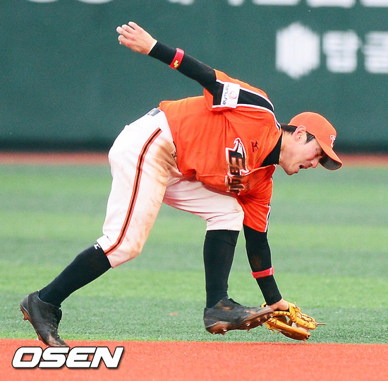 27일 오후 서울 목동구장에서 열린 넥센 히어로즈와 한화 이글스의 경기에서 3회말 첫타석에서 넥센 김민우가 친 땅 볼을 한화 2루수 한상훈이 달려나오며 잡아내고 있다.