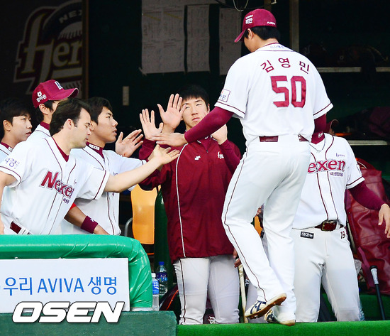 27일 오후 서울 목동구장에서 열린 넥센 히어로즈와 한화 이글스의 경기에서 김영민이 5회초 2사 주자 1,3루 한화 정범모 타석에서 넥센 선발 김영민이 교체되며 덕아웃에서 동료들과 하이파이브를 하고 있다.