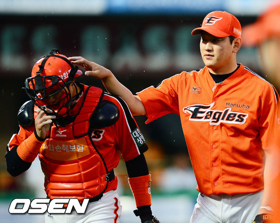 27일 오후 서울 목동구장에서 열린 넥센 히어로즈와 한화 이글스의 경기에서 5회말을 마친 양훈이 정범모 포수의 머리를 쓰다듬고 있다.