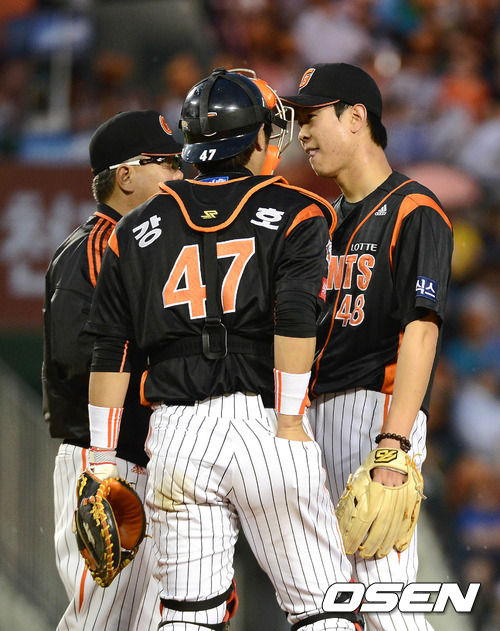 27일 오후 잠실야구장에서 열린 '2012 팔도 프로야구' 두산 베어스와 롯데 자이언츠의 경기, 6회말 2사 1루 두산 최준석 타석때 롯데 진명호가 마운드에 올라온 양승호 감독과 이야기를 나누고 있다.