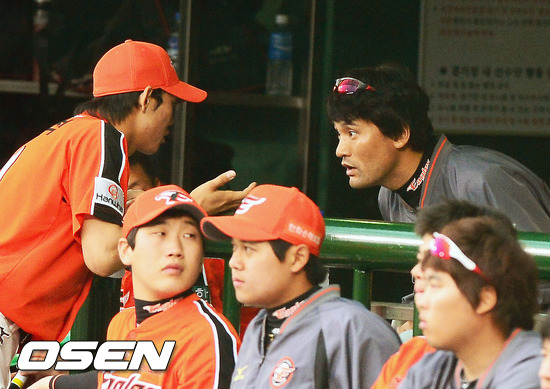 27일 오후 서울 목동구장에서 열린 넥센 히어로즈와 한화 이글스의 경기에서 한화 덕아웃에서 박찬호가 하주석과 얘기를 나누고 있다.