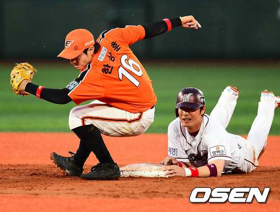 27일 오후 서울 목동구장에서 열린 넥센 히어로즈와 한화 이글스의 경기에서 5회말 1사 주자 1루 넥센 허도환의 삼진 아웃때 1루 주자 강병식이 도루를 시도, 2루에서 한화 2루수 한상훈에게 태그아웃 당했다. 한상훈이 태그아웃 시킨 후 균형을 잡고 있다.