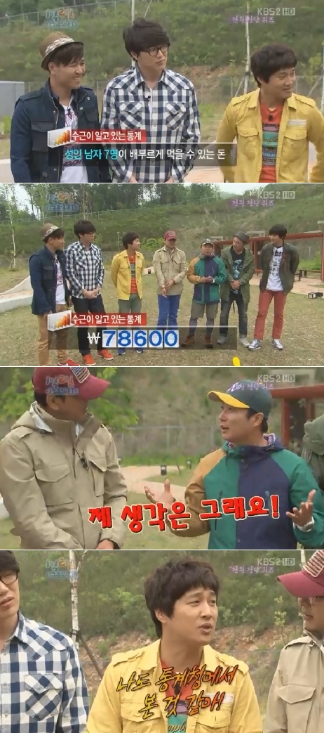 멤버들이 놀란 표정으로 "정말이냐"고 묻자 이수근은 "그냥 제 생각은 그렇다"며 머뭇머뭇 변명을 했다. 그러나 차태현은 "아니다. 나도 통계청에서 자료를 본 것 같다"고 정색해 웃음을 자아냈다.