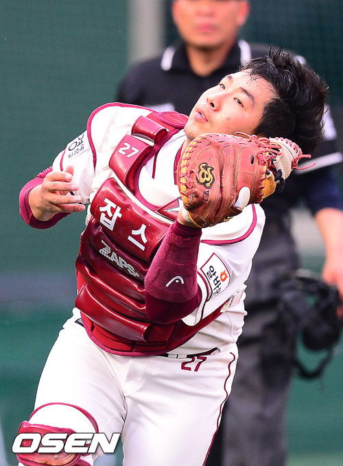 27일 오후 서울 목동구장에서 열린 넥센 히어로즈와 한화 이글스의 경기에서 4회초 1사 넥센 허도환이 한화 양성우의 파울플라이를 잡아내고 있다.