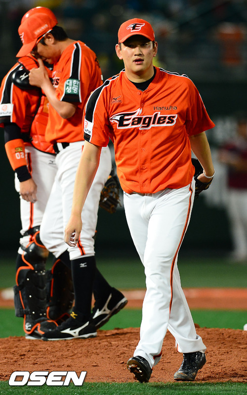 27일 오후 서울 목동구장에서 열린 넥센 히어로즈와 한화 이글스의 경기에서 8회말 2사 주자 1,3루 넥센 박병호 타석에서 한화 선발 양훈이 마운드를 내려가고 있다.