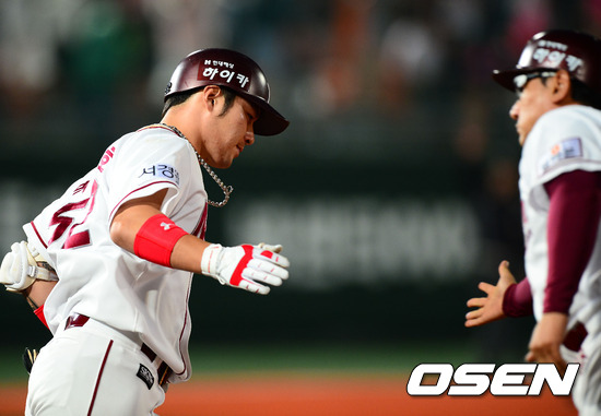 27일 오후 서울 목동구장에서 열린 넥센 히어로즈와 한화 이글스의 경기에서 8회말 2사 주자 1,3루 넥센 박병호가 바티스타의 초구를 때리며 좌월 스리런 홈런을 날린 후 1루에서 심재학 코치와 하이파이브를 하고 있다.