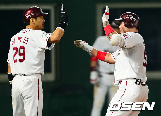 27일 오후 서울 목동구장에서 열린 넥센 히어로즈와 한화 이글스의 경기에서 8회말 2사 주자 1,3루 넥센 박병호가 바티스타의 초구를 때리며 좌월 스리런 홈런을 날린 후 홈에서 선행주자였던 이택근과 하이파이브를 하고 있다.