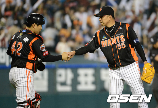 경기 종료 후 롯데 김사훈과 김사율이 승리의 기쁨을 나누고 있다. / sunday@osen.co.kr