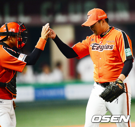 27일 오후 서울 목동구장에서 열린 넥센 히어로즈와 한화 이글스의 경기에서 8회말 2사 주자 1,2루 넥센 지석훈 타석에서 바티스타 대신 마운드에 오른 안승민이 지석훈을 2루수 땅볼 아웃시킨후 이준수 포수와 하이파이브를 하고 있다.