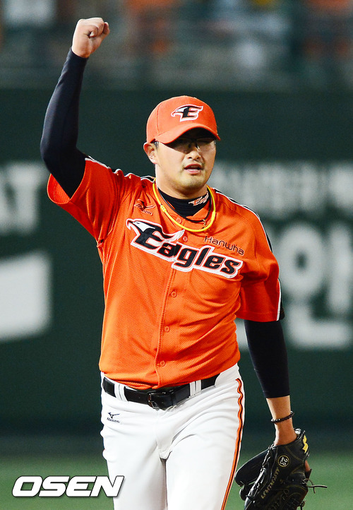 경기를 마치고 마무리로 올라온 한화 안승민이 주먹을 치켜올리고 있다. / rumi@osen.co.kr