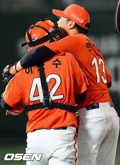 경기를 마치고 한화 안승민이 이준수와 포옹을 하고 있다. / rumi@osen.co.kr