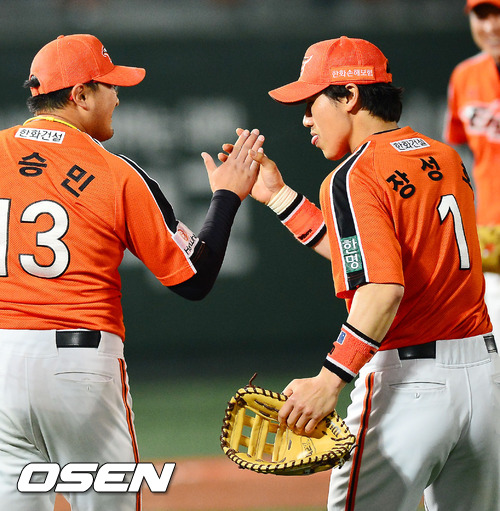 경기를 마치고 한화 안승민과 장성호가 하이파이브를 하고 있다. / rumi@osen.co.kr