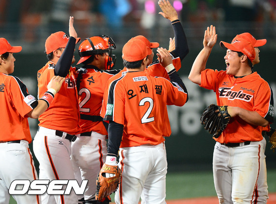 경기를 마치고 한화 선수들이 마운드 근처에 모여서 기쁨을 나누고 있다. / rumi@osen.co.kr