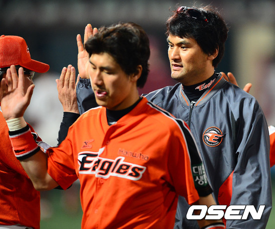 경기를 마치고 한화 박찬호가 한대화 감독과 하이파이브를 하고 있다. / rumi@osen.co.kr