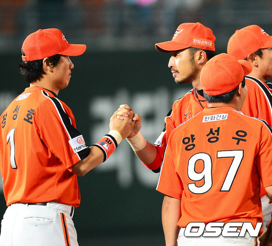 경기를 마치고 한화 장성호와 김경언이 하이파이브를 하고 있다. / rumi@osen.co.kr