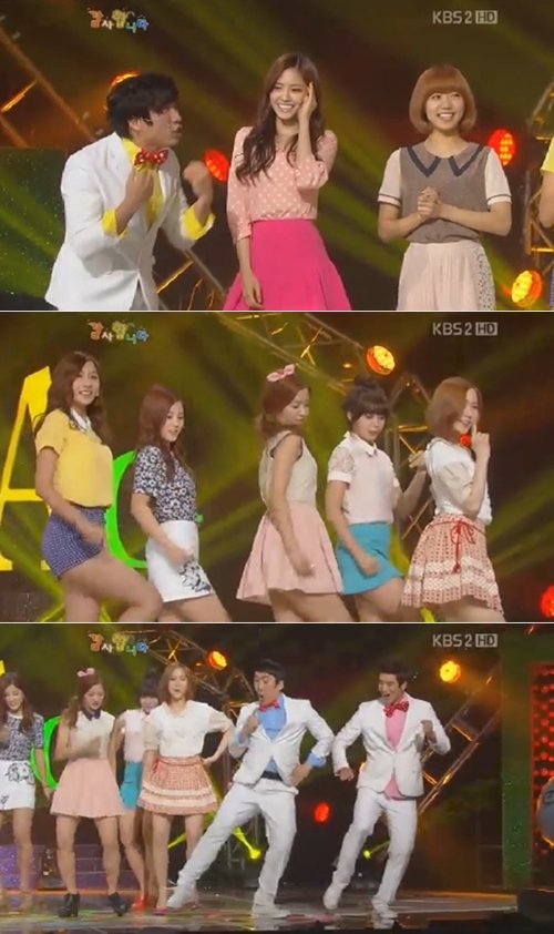 걸그룹 에이핑크가 KBS 2TV '개그콘서트'에 깜짝 출연해 각선미를 과시했다.