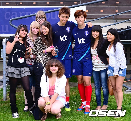 훈련을 마친 구자철과 손흥민이 스위스 여성팬들과 포즈를 취하고 있다./ soul1014@osen.co.kr