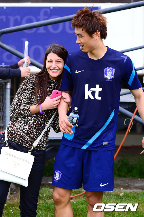 훈련을 마친 구자철이 스위스 여성팬과 포즈를 취하고 있다/ soul1014@osen.co.kr