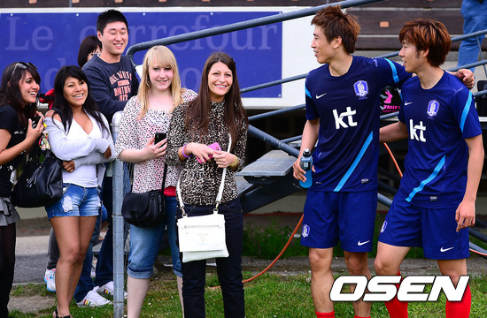 훈련을 마친 구자철과 손흥민이 스위스 여성팬과 이야기를 나누고 있다/ soul1014@osen.co.kr