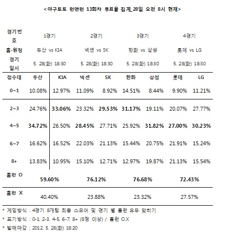 국민체육진흥공단(www.kspo.or.kr)이 발행하는 체육진흥투표권 수탁사업자인 스포츠토토 공식 온라인 발매 사이트인 베트맨(www.betman.co.kr)이 오는 29일(화) 오후 6시 30분에 열리는 2012 프로야구 4경기 8개팀을 대상으로 한 야구토토 런앤런 13회차 투표율을 중간집계 결과, 참가자들의 대다수인 76.68%는 한화-삼성(3경기)전에서 홈런이 나올 것으로 예상했다.
