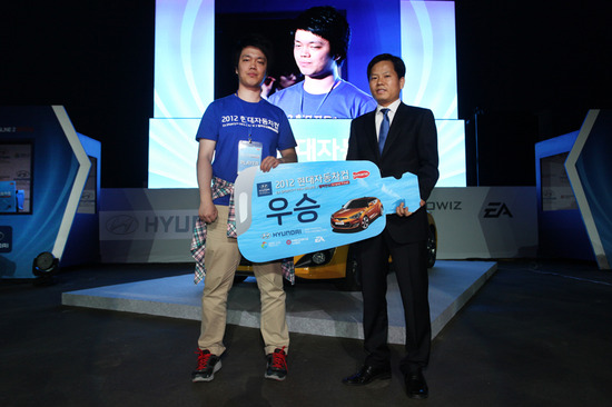 현대자동차(회장 정몽구)는 27일 여수엑스포 특별무대에서 ‘2012 현대자동차컵 FIFA 온라인 2 챔피언십’ 결승전을 열어 최종 우승자 양진모 씨에게 벨로스터 1대를 상품으로 제공했다.