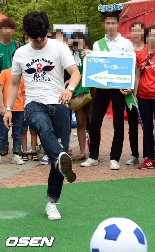 28일 오후 서울월드컵경기장 북측 광장에서 진행된 'Seeing is Believing(이하 SiB) 기금 마련 축구 자선 행사'에 안정환이 안대를 착용하고 페널티킥을 시도하고 있다.