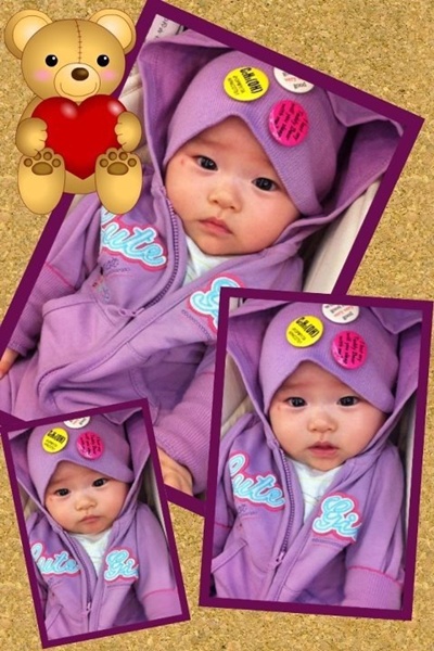 공개된 사진 속에는 보라색 후드 점퍼와 모자를 쓰고 있는 아기가 카메라를 응시하고 있다. 노유민을 닮은 듯한 동그란 눈과 귀여운 외모가 눈길을 끌었다.