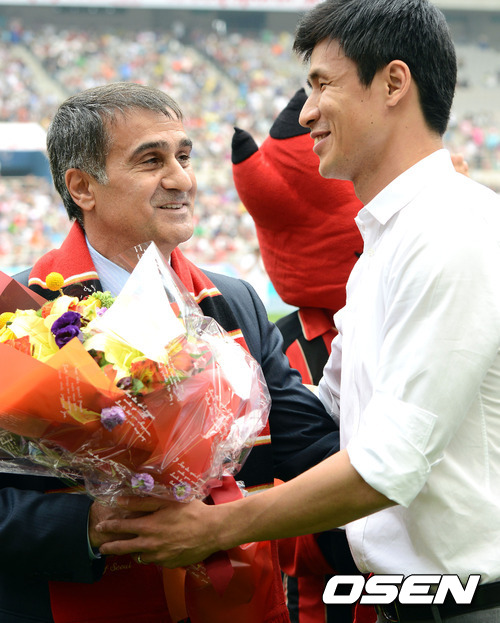 경기전 귀네슈 전 FC 서울 감독이 정조국에게 꽃다발을 받고 있다. / youngrae@osen.co.kr
