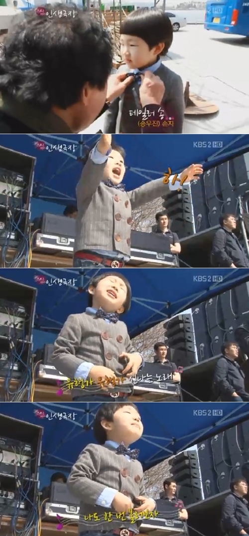 송대관은 28일 오후 방송된 KBS 2TV '스타 인생극장'에 출연해 할아버지의 끼를 쏙 빼닮은 손자 송우진(송 테일러) 군의 모습을 공개했다. 우진 군은 송대관의 첫째 아들 진형 씨의 아들이다.