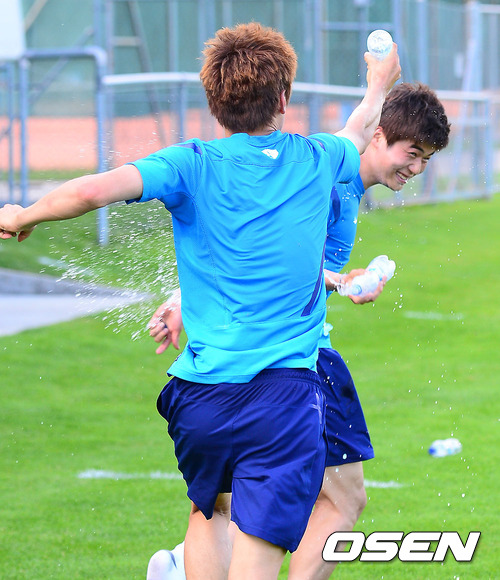 훈련을 끝낸 구자철이 기성용의 장난에 복수하고 있다./ soul1014@osen.co.kr