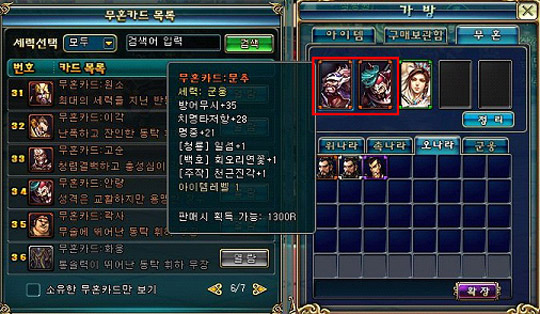 무혼 카드는 일반(흰색)부터 고급(남색), 희귀(녹색), 유일(보라색), 영웅(주황색)까지 총 5개 등급으로 나뉜다. 등급이 높을수록 추가할 수 있는 능력치가 크며, 명장의 능력을 더욱 강하게 끌어낼 수 있다. 그렇다고 감정 결과, 카드의 등급이 낮게 나온 것에 상심할 필요는 없다. 중복 수집했거나 불필요한 카드 다섯 장과 합성해 업그레이드를 할 수 있기 때문. 또한 가장 높은 영웅(주황색) 등급의 무혼카드는 오직 합성을 통해서만 획득 할 수 있다.