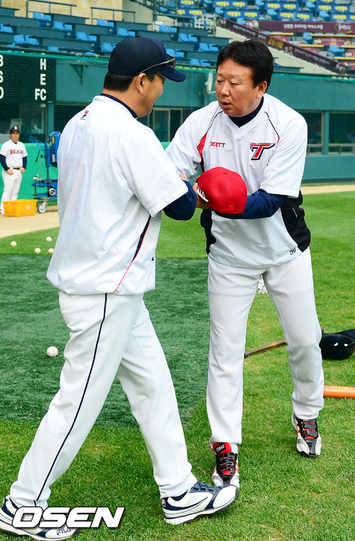 29일 오후 서울 잠실구장에서 두산 베어스와 KIA 타이거즈의 경기가 열릴 예정인 가운데 양 팀 훈련시간에 두산 김진욱 감독과 KIA 선동열 감독이 악수를 나누고 있다.