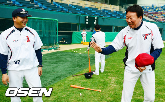 29일 오후 서울 잠실구장에서 두산 베어스와 KIA 타이거즈의 경기가 열릴 예정인 가운데 양 팀 훈련시간에 두산 김진욱 감독과 KIA 선동열 감독이 악수를 나눈 후 김진욱 감독의 6연승 축하에 선동열 감독이 쑥스러워하고 있다.